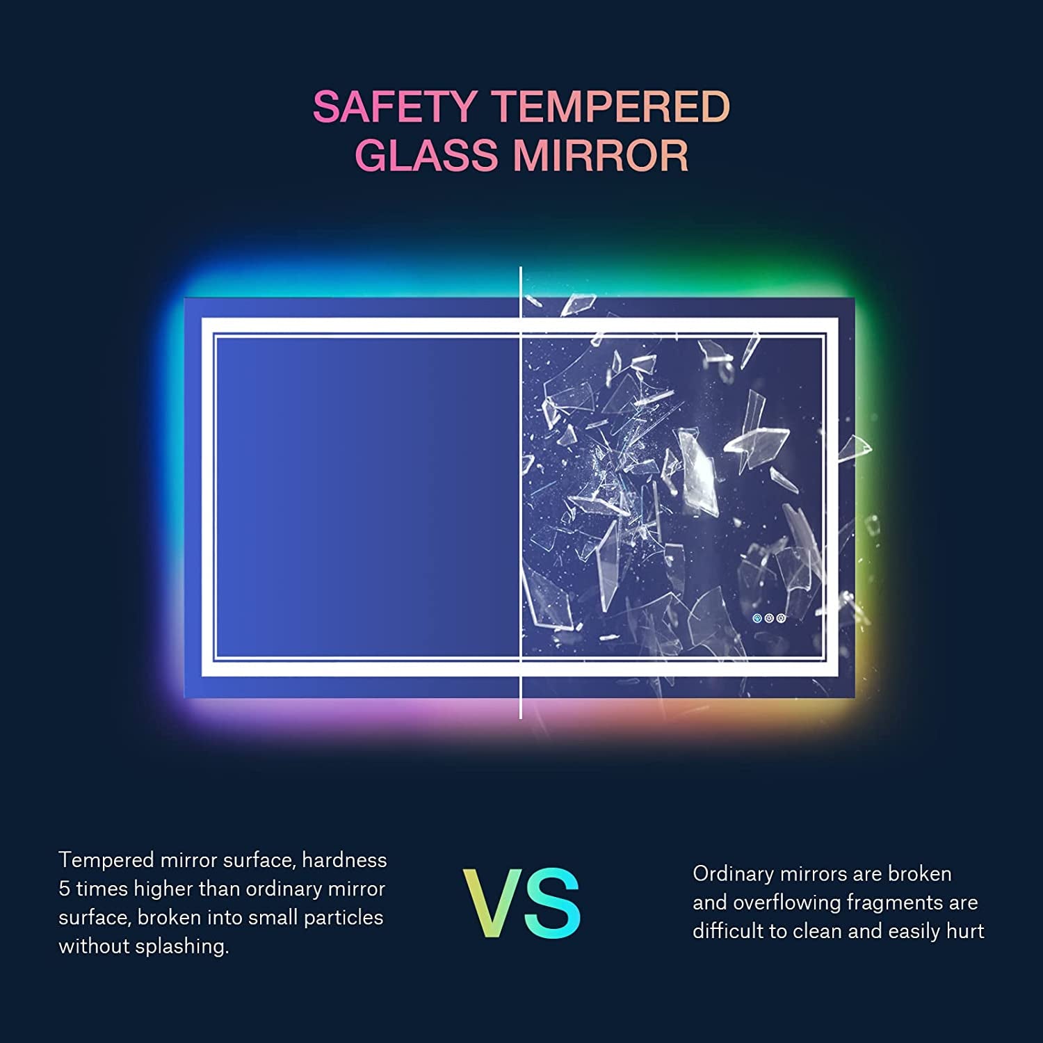 Crafted from resilient 5MM tempered glass, our RGB vanity mirror ensures durability, shatter-proof performance, and a touch of modern elegance.