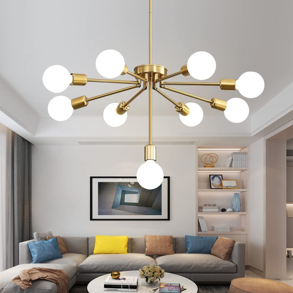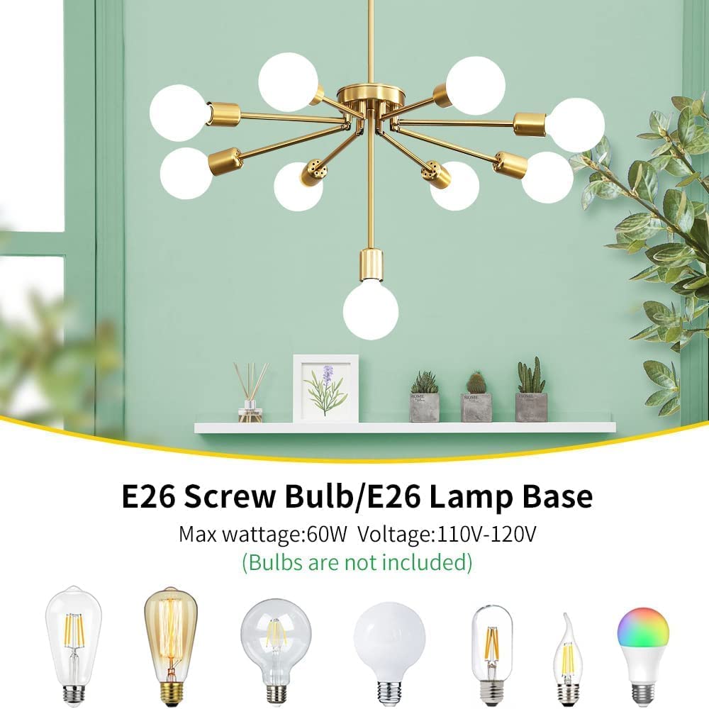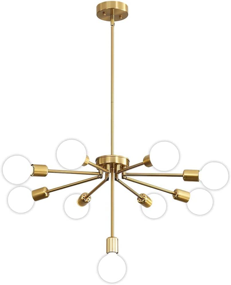 - 🏡【Unique Design】 Our farmhouse chandelier is made of high-quality brass metal, the golden surface is stylish and beautiful. 8 of the lamp arms can be rotated 90 degrees, and the shape can be changed according to the location. Sputnik chandeliers are not only suitable for mid century style, but also suitable for modern style. The brass chandelier is perfect for farmhouse kitchen, dining room, bedroom, living room, foyer attic, bar, coffee shop, restaurant, home office, clubs, and galleries.
