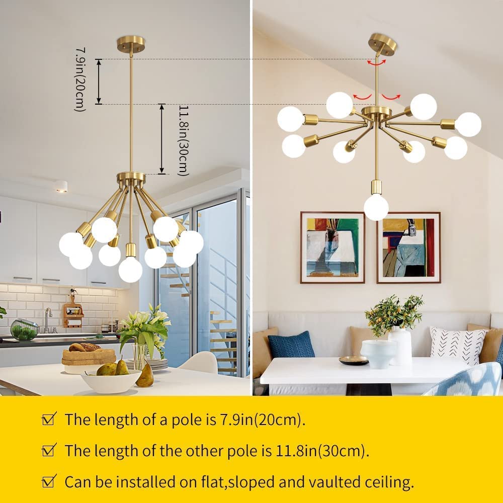 - 🏡【Adjustable Height】 Our modern chandelier can be installed on flat, arched, or sloping ceilings. And the gold chandelier has 2 hanging rods, 7.87" and 11.81" in length. You can adjust the height of the light fixture according to your needs.