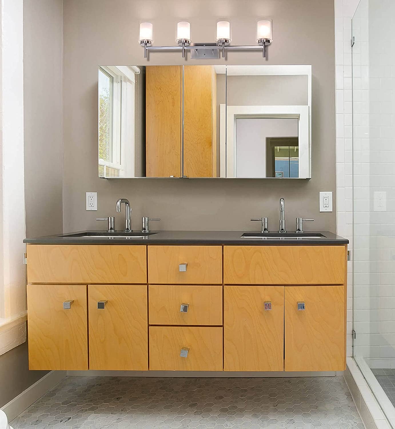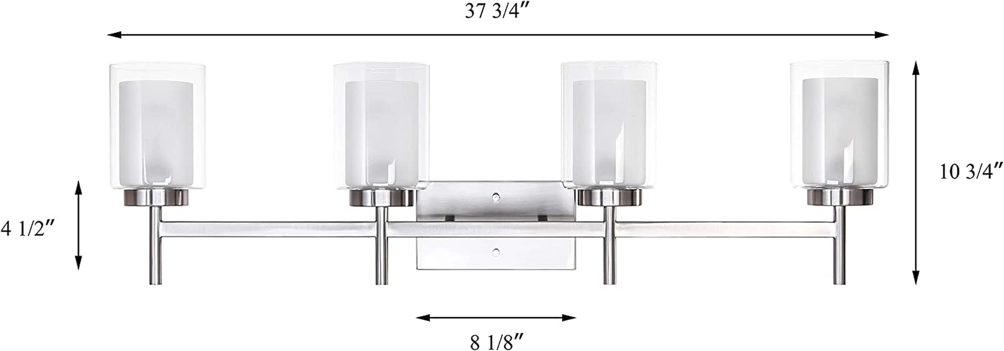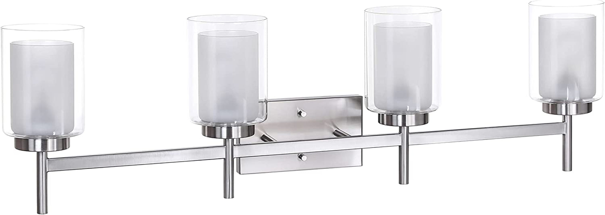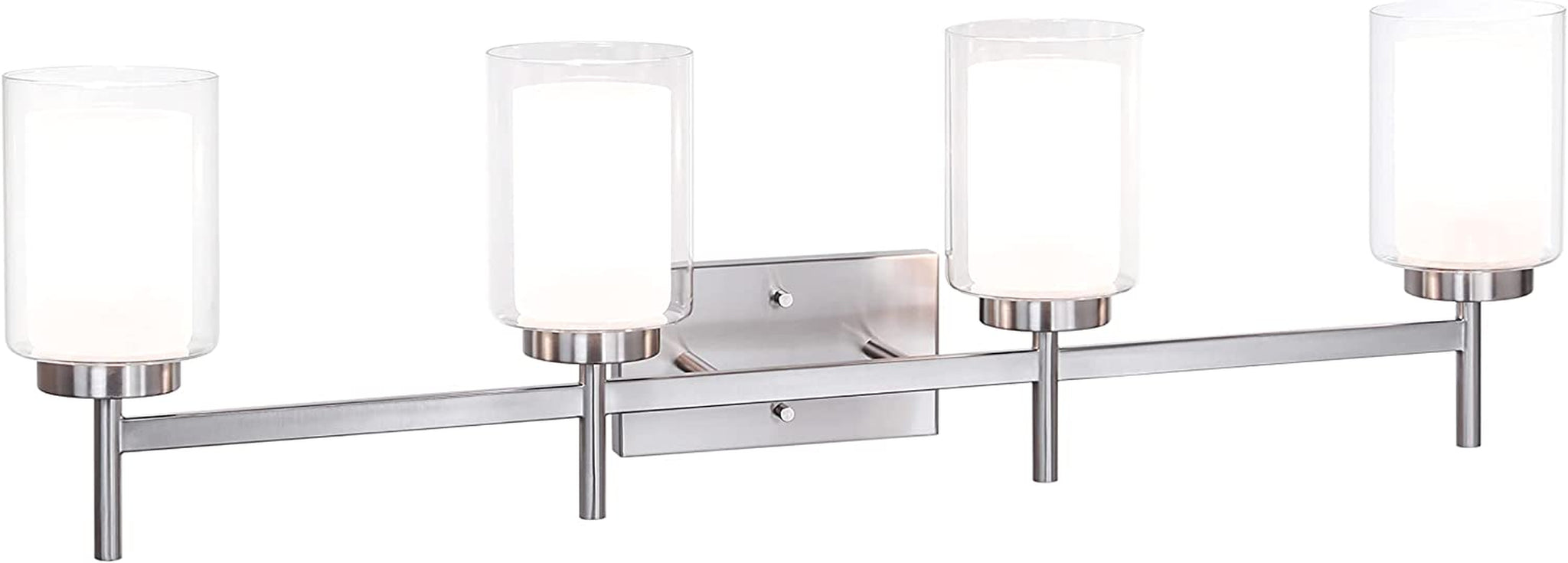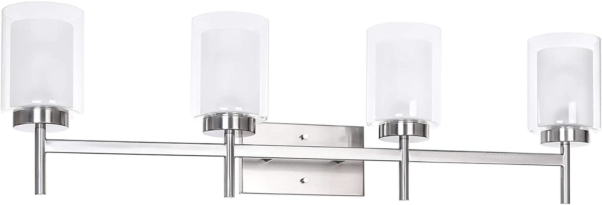 - MODERN DESIGN: The aesthetically constructed bathroom vanity light brings a modern style to your bathroom, bedroom, kitchen & living room.The 4-light sconces wall lighting in brushed nickel finish is partnered with the dual glass shade to work with a wide range of home decor.
