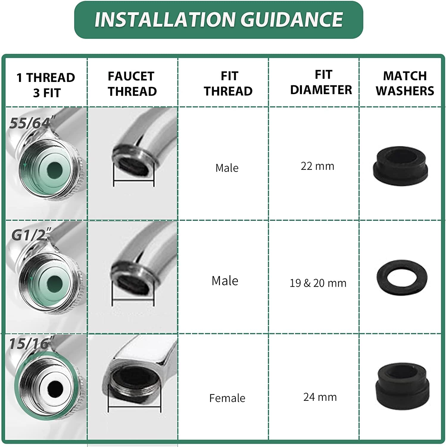 Firstly, fit for the faucet of US standard male thread 55/64″ (22 MM), and match the medium thickness leakproof washer. Secondly, fit for the faucet of the female thread 15/16″ (24 MM), and match the thickest leakproof washer.