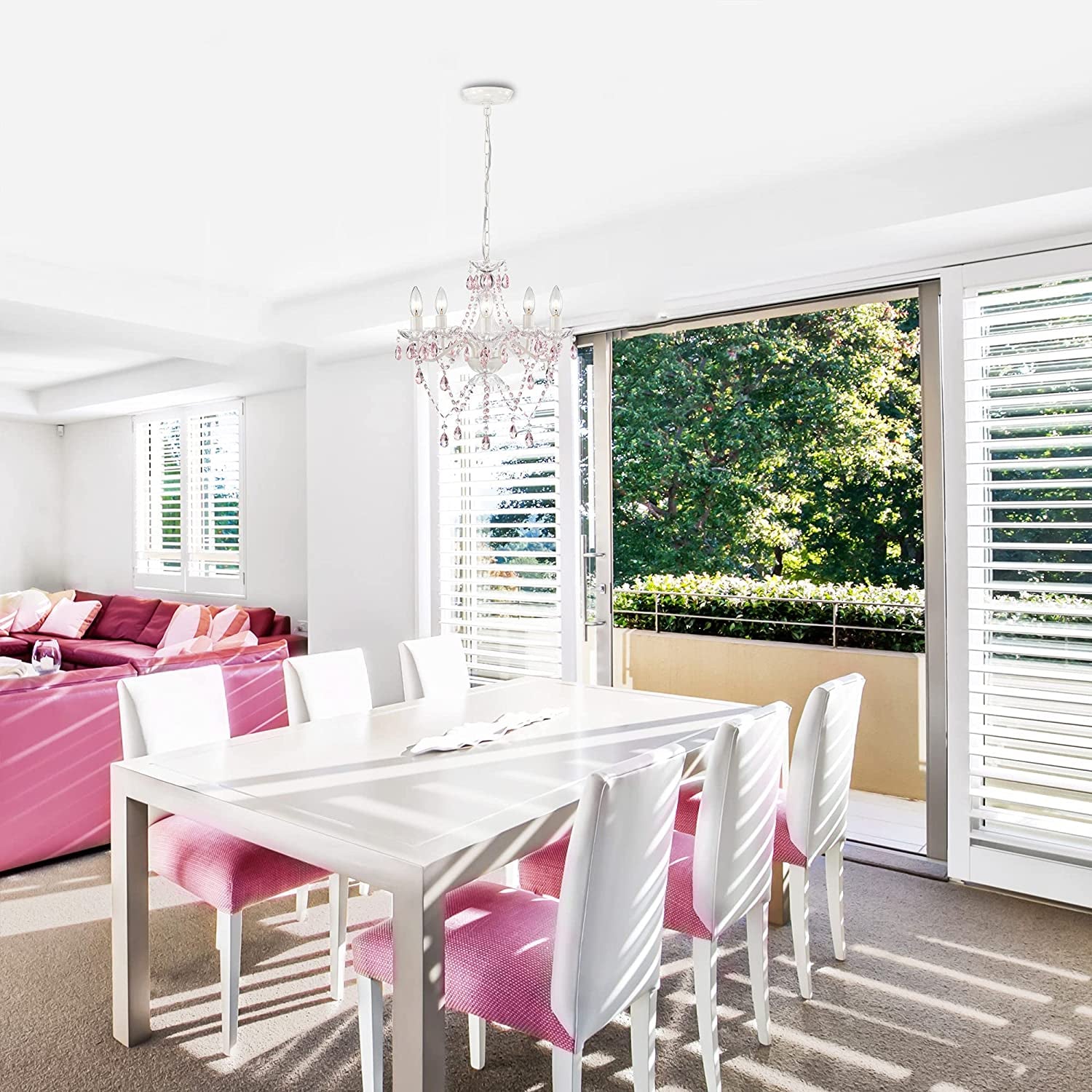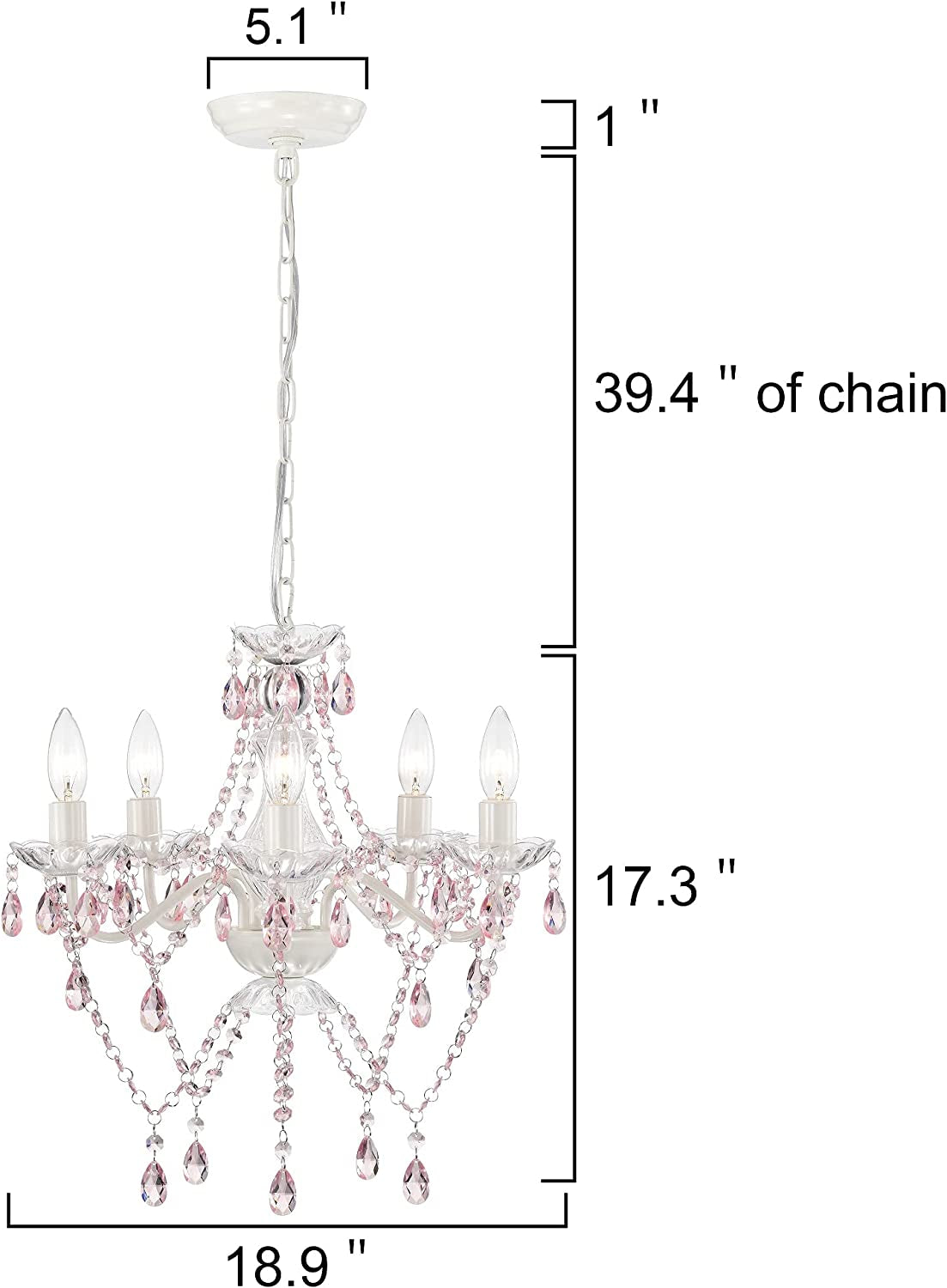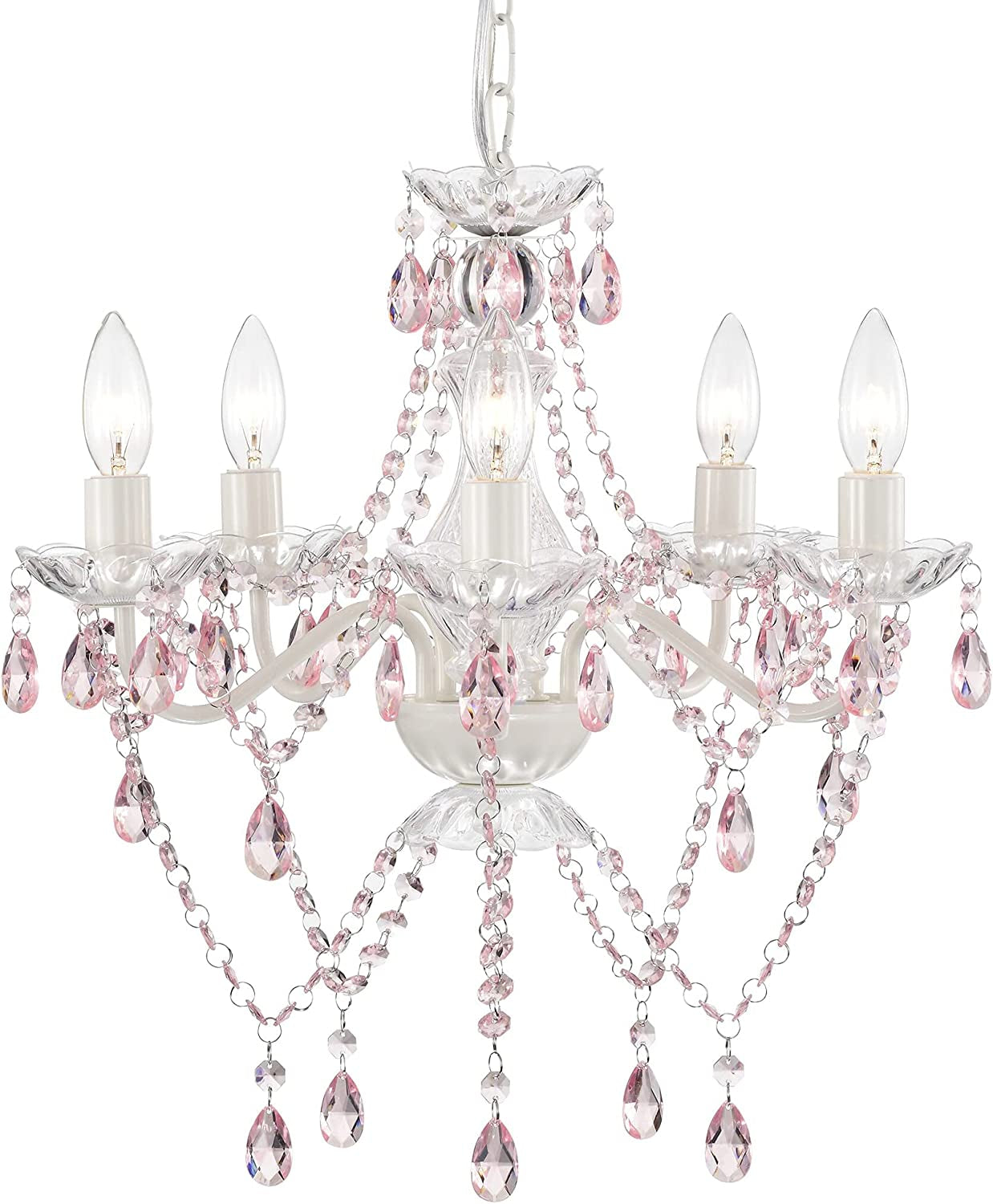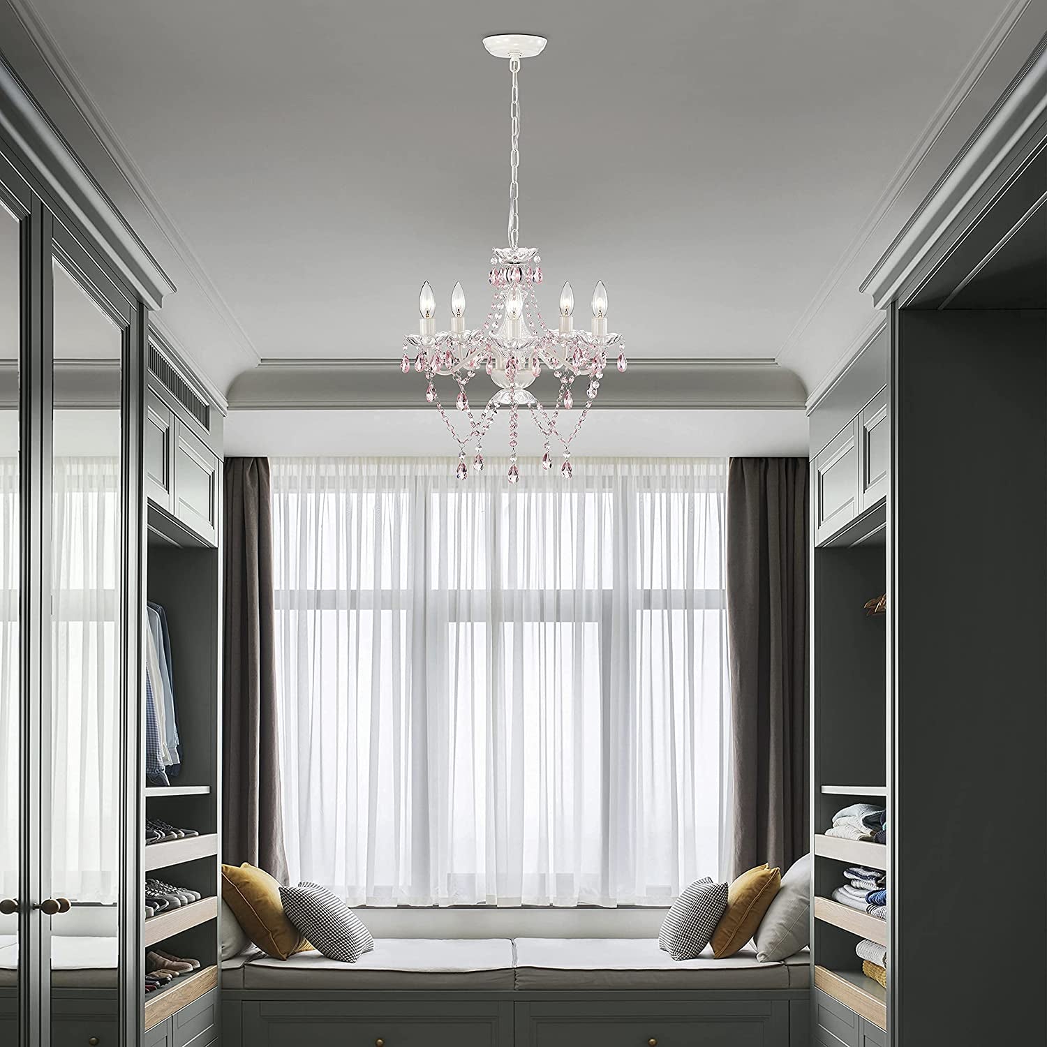 This beautiful white chandelier for bedroom features a 5-light design and is decorated and draped with pink acrylic crystals that capture and reflect the light of the bulbs. The frame is wrought iron, adding the finishing touch to a wonderful fixture.